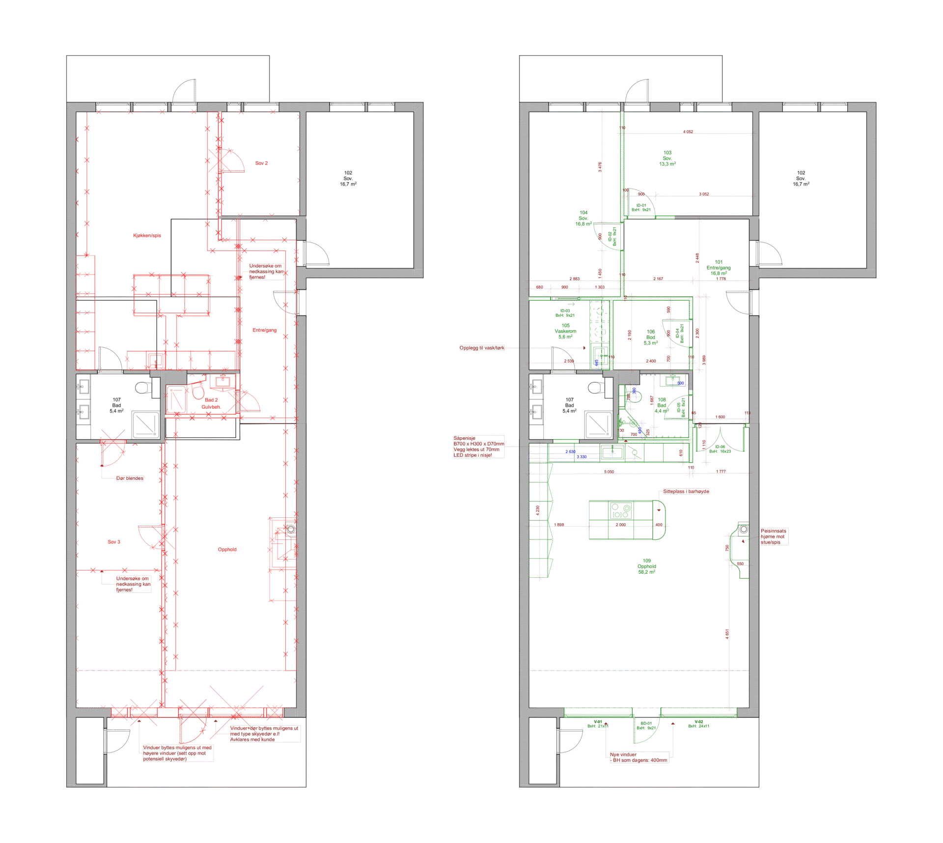 Tegningsgrunnlaget sikrer kvalitet. Et godt og presist tegningsunderlag er avgjørende for et smidig og velfungerende byggeprosjekt. Vi utarbeider tekniske tegninger som danner et solid grunnlag for både prosjektering og utførelse – inkludert planløsninger, rivningsplaner, nye konstruksjoner, møbleringsplaner, belysningsplaner, overflatebehandling av vegger og gulv, snitt og oppriss..